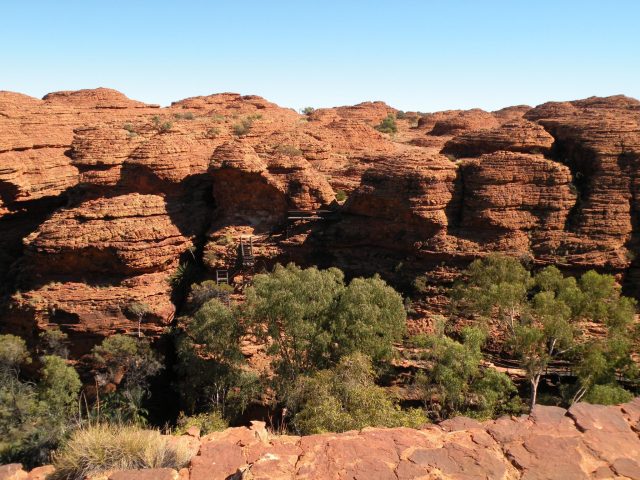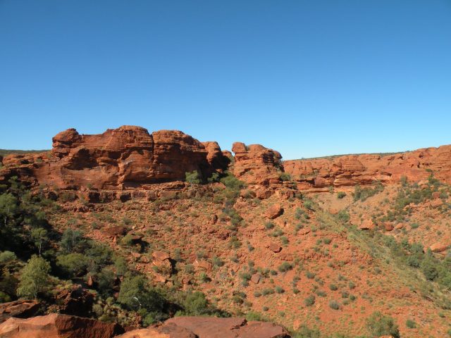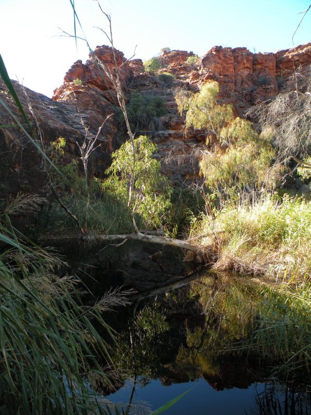 Even with a school group camped next to us we managed a very peaceful sleep, far away from the rest of civilisation. After breakfast we packed some lunch and plenty of water for a day of walking in Kings Canyon. Our first stop was the Kathleen Springs walk. It was a mostly flat, easy return walk of two kilometres. In previous days the area had been used by local Luritja aboriginals as it had a good water supply at the Springs. More recently it was used by cattle drovers. As we walked in to the Springs we passed some of the disused infrastructure from the cattle droving.