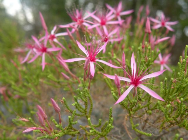 As we were running out of time and petrol we drove back to Batchelor to access wifi and buy petrol. Along the road verge we were impressed by splashes of pink flowers, Calytrix tetragona, locally referred to as the flower welcoming visitors.