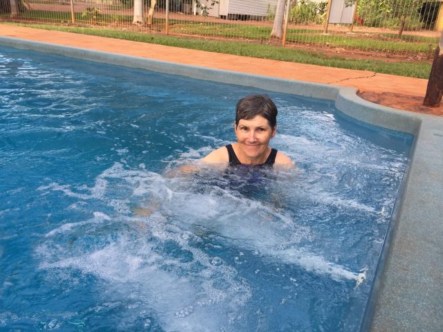 It didn’t take long to set up the caravan. This gave us time to head over to the swimming pool. About a dozen others, all ‘Grey Nomads’ were already relaxing there. Initially we had a chat while we relaxed with water jets massaging us.