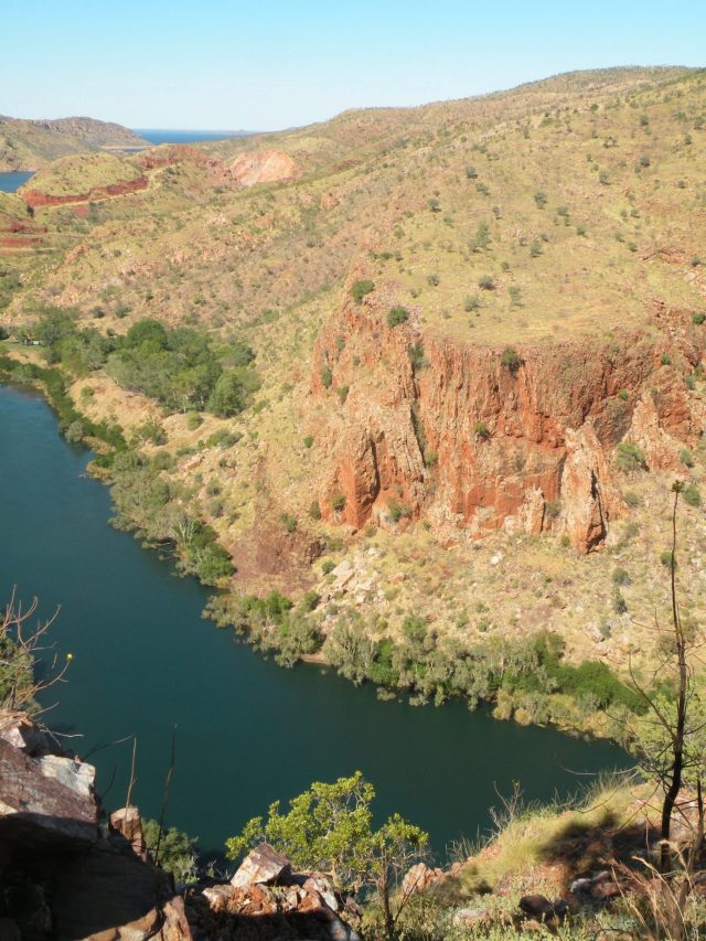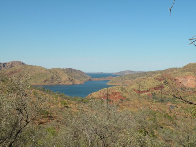 As it would be a fairly hot day we decided to walk early and late and have a swim during the hottest part of the day after lunch. So off we walked up to the Lake Argyle Lookout. It wasn’t a particularly long walk but the trail’s surface was uneven in spots as we climbed. Very quickly we had a view of the main branch of the lake.