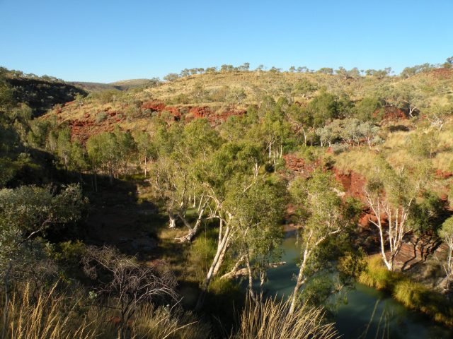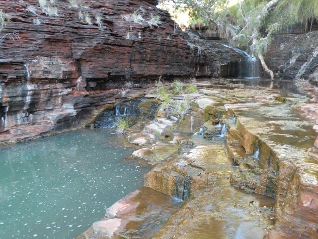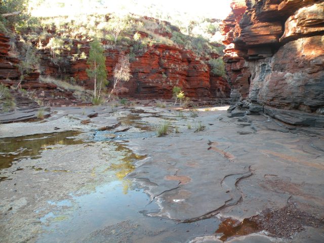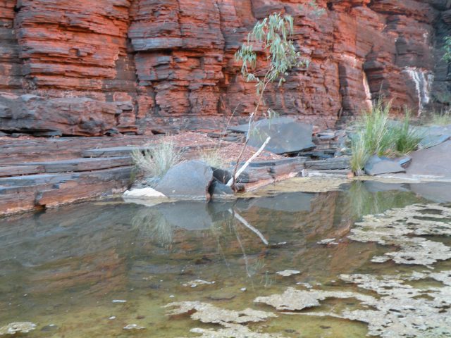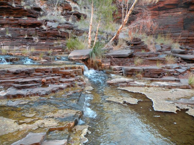 We arrived back at the steps leading up to the car park just before five o’clock. The drive back on the gravel road with fading light was quite bumpy in spots. We had completed two fantastic walks but there was a twist in the tale. Just as we came off the unsealed road near the Visitor Information Centre we sensed something wasn’t quite right with our vehicle so we pulled up about a hundred metres along where there was a shoulder to safely stop on. Bugger! We had a blown out tyre! We had been lucky to this point and never had a flat with the Hills. This meant taking out the manual and reading where to install the jack and how to release the spare which was under the back ute section. Just as we were getting started another ute pulled up behind us and a guy and his wife and three young sons clambered out and offered to help us. We gladly accepted. They lived up in Port Hedland and were on a day trip to explore a bit of Karijini and return back home again. That’s a round trip of 800Kms plus whatever they had driven in Karijini! Turned out he was a trucky working in the mines and was well used to long drives and changing tyres. Between us we did the changeover just as darkness came on. iPhone torches are very useful! After a bit of a chat and thanking them we made our way slowly back to Dale’s Campground for the night. Sadly tomorrow wouldn’t be exploring more of Karijini as planned. We would be carefully making our way to Tom Price and looking to replace at least one tyre.