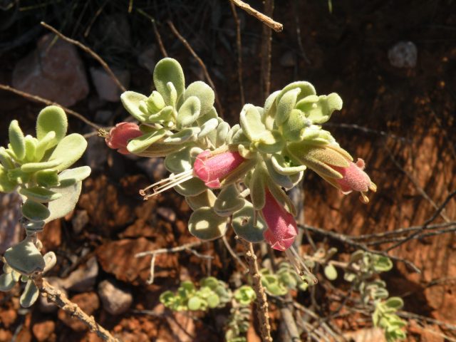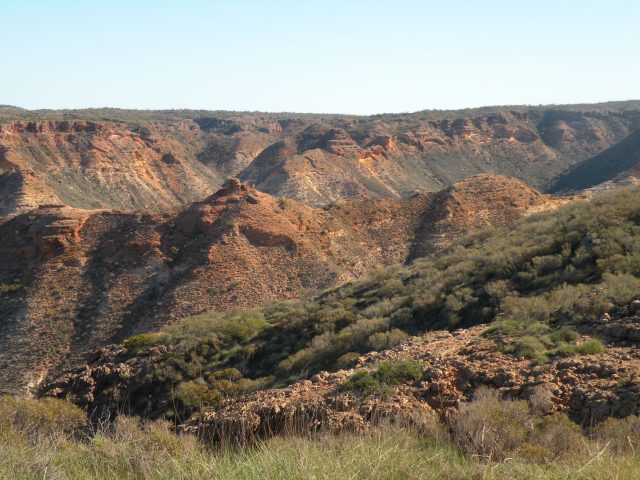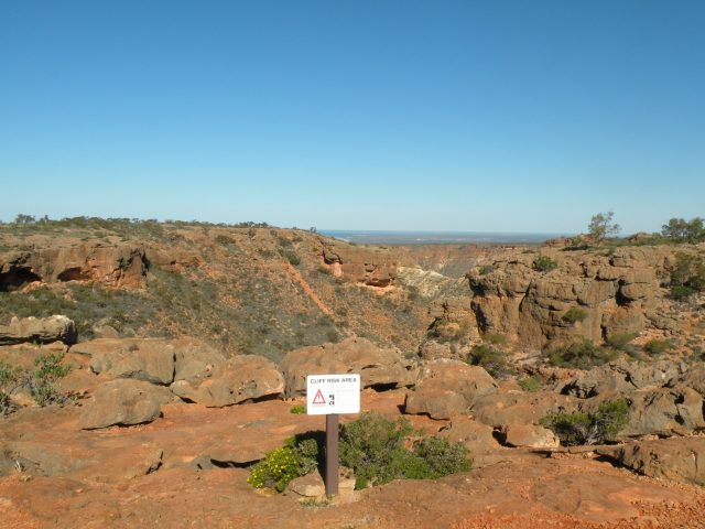 Once we had settled in at the Exmouth Cape Holiday Park we ate lunch. We had gathered lots of information at the very well set up Tourist information Centre and decided to head back south that afternoon to the Charles Knife Gorge to do some walking and wildflower hunting. After heading south for about 20kms we turned west and drove into the gorge, initially on a sealed road but when it became gravel it was still a good driving surface. At our first stop we had a fantastic view back to the south east side of the cape.