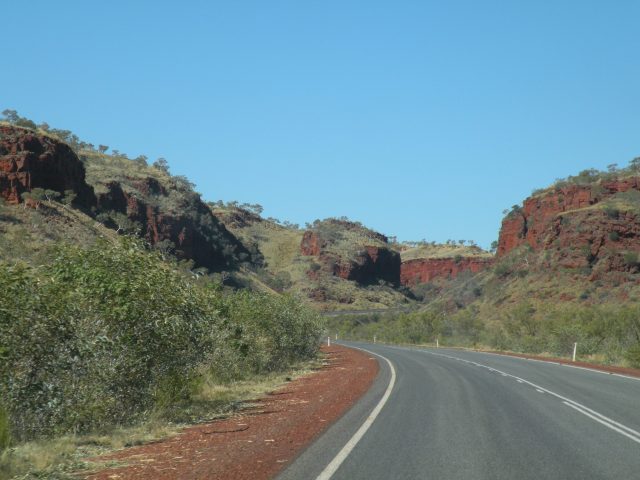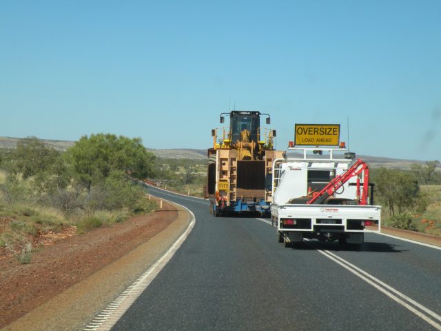 After an overnight stop in Port Hedland we headed inland on Highway 95 towards the mining town of Newman. The first section would be about 290kms before the turn off to Karajini. Things were going smoothly until just before 11:00 when we started to back up in a line behind something. As most of the vehicles in front of us were also large we couldn’t see what was holding us up so we turned on our UHF radio. As I was driving Karen worked the radio. It soon became apparent it was an oversize vehicle carrying equipment and that when possible they were allowing vehicles past them. After about twenty minutes we found ourselves right behind the rear pilot truck. Within three minutes we came to a floodway which had a wider shoulder than other parts of the road and we received the all clear to pass the oversize vehicle.