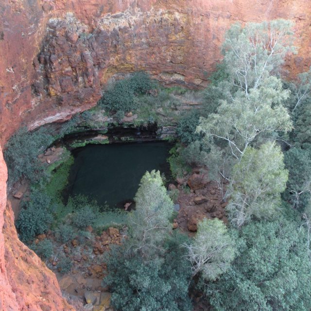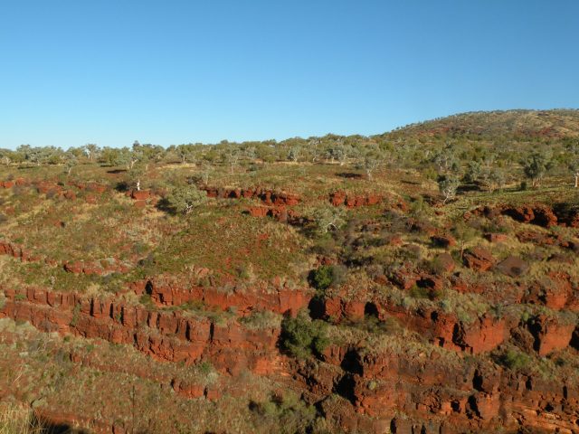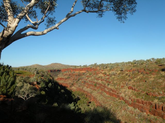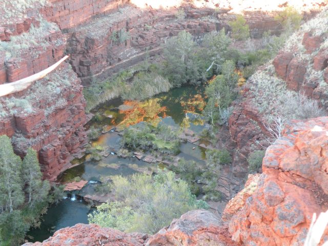 With about 50kms to the turnoff into Karajini we reached the Auski Roadhouse. We had heard mixed reports about staying here. However once we saw it for ourselves we decided the dusty conditions on the main road made it a far from ideal place to stay. Just driving into the petrol pumps over the massive dips in the unsealed entry way was a challenge. Anyway we filled up on diesel and continued down to the turnoff to Karajini. On reaching the intersection to the Information Centre and Dale’s Gorge Camping Ground we decided to check out things first at the Information Centre. It was really well set up with excellent displays, which we decided to come back to later on in our stay. Sadly we found out that the camping area was already full but there was a possibility to camp in an overflow area so off we drove. The Parks ranger met as the turnoff to this overflow area and explained what to do. Camping was free there for one night. There was drinking water and drop toilets but if we wanted a shower you paid to use the ones at the Information Centre. He suggested that early the next day we drive into Dale’s Gorge Camping Ground and queue up. Most days there was a turnover of campers and we would probably be alright to get in the next day. So into the overflow area we drove and found a good spot which would be mostly in shade for the rest of the day. We set up the caravan and ate a very late lunch in the caravan. By this time it was about 15:30 but we felt it would be a good idea to drive the 10kms to check out things for the next day. We found the camping area pretty easily. From there we drove a bit further into the Dale’s Gorge day parking area. Several walks could be done from there. After looking at the map and seeing the distances of the walks we decided to do the rim walk. Pretty quickly it became apparent this was a spectacular gorge indeed.