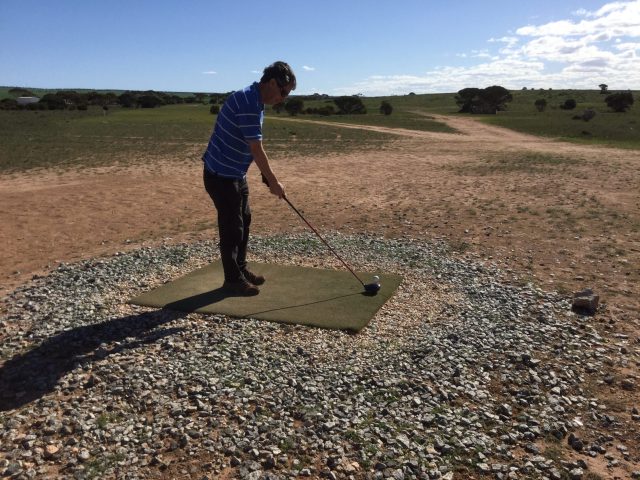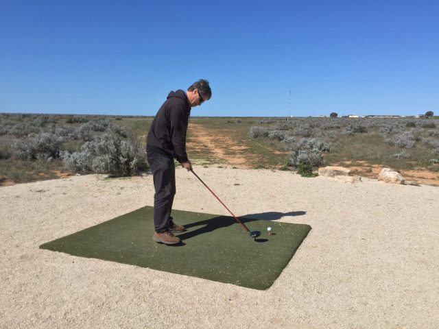 so I could play the next hole of the Nullabor Links. This hole was a par 5 of 538 metres and you had to walk that far and more to reach the tee to start it. It was in a field past the airstrip for the Royal Flying Doctor.