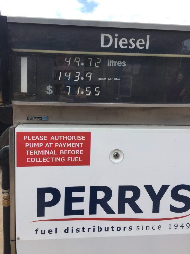 The fuel gauge in the Hilux began to drop so we decided to refuel at one of the small towns. The price of 143.9 cents/litre was the highest we had paid anywhere on our trip, even higher than Kings Canyon, which we thought was probably more remote.