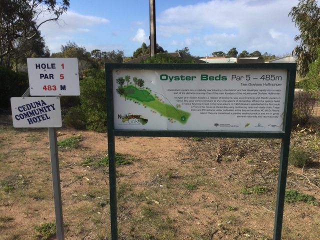and on to Ceduna. To start with we headed out to the golf course. Ceduna Gold Club hosts the final two holes of the Nullabor Links. The first hole is a par 5 named Oyster Beds after one of the successful local aquaculture industries.
