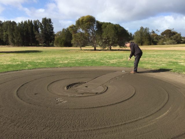 The greens here weren’t green, as they are sand scrape greens. You are permitted to rake a path between your ball and the hole to putt along.