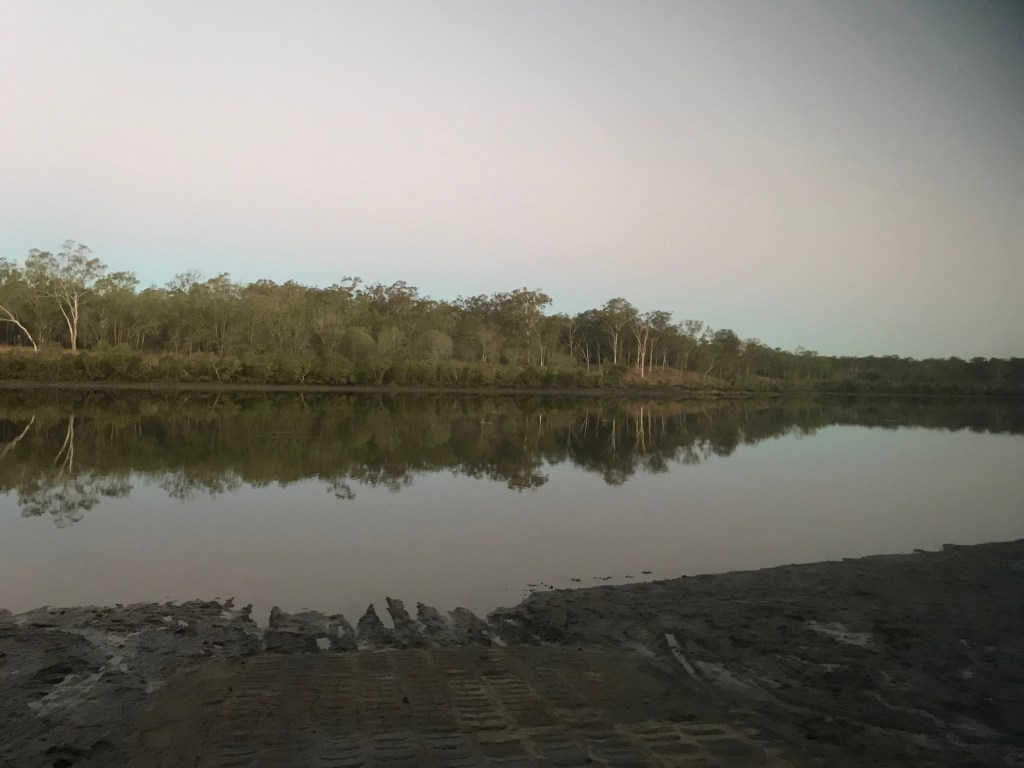 We passed through a number of small towns. The name of one of them tickled our funny bone, Banana. It was here we switched to State Route 60 to head to Bileola, where we stopped for lunch. We stayed on this road for most of the remainder of the afternoon, only using a few local roads to arrive at our next overnight stop, Boyne Island Caravan Park. After setting up the caravan we took a walk out the back of the park where the boat ramp was located.