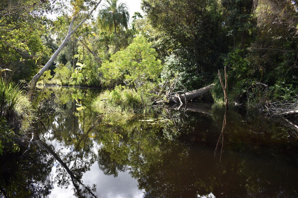 After another leisurely start to the day of breakfast followed by cut lunch preparation we drove north about 10:00 from Yeppoon to Byfield State Forest for the day. Initially we headed to the Upper Stoney day use area. As we left our parked car we couldn’t help but notice the amazing reflection in the Stoney Creek. Just stunning.