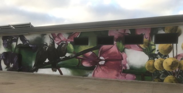 Back at home we had successfully applied for a border permit on our mobile phones but no one stopped us to check them. Our drive continued through the small town of Finley and we ended up in Jerilderie, where we checked in for the night at the caravan park/motel. After setting up the caravan we took Mel for a walk back into town. The wall of the pool building was colourfully decorated with some local flora and fauna.