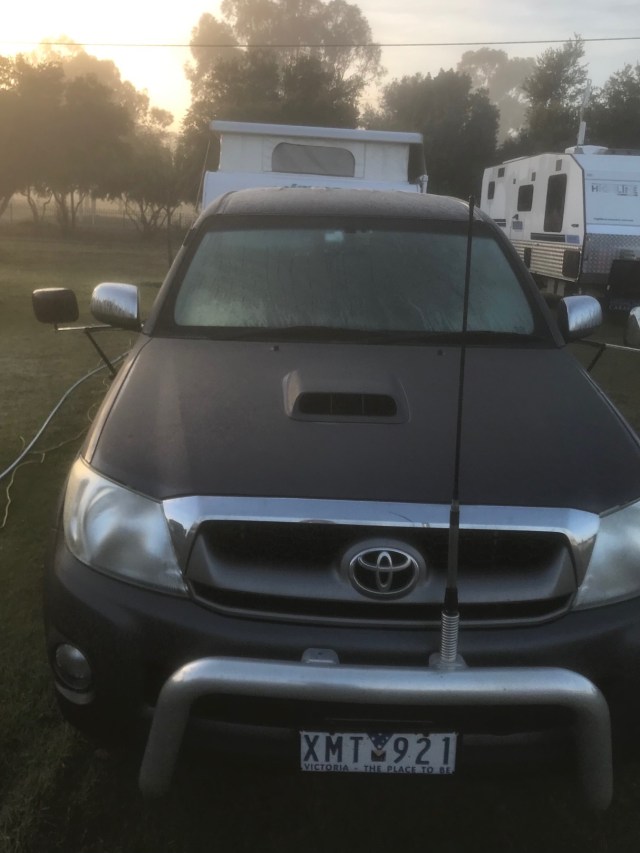 Boy did it drop! The next morning we found quite a layer of ice on the windscreen of the Hilux, which I scraped off before we set off.