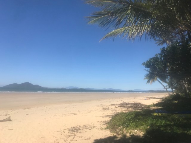 Back home there is a local market every weekend somewhere on the Mornington Peninsula. So we were pleased to find out there is a fortnightly market in Mission Beach right opposite the Hideaway Holiday Village. From local produce to clothing and jewellery to plants, books, food and hot drinks, it had just about everything you’d expect at a local market. Best of all it was situated in a lovely shady area adjacent to the beach. We purchased some fruit and veggies  at very reasonable prices from a couple of stalls. We also had a good chat with one of the coffee stall operators and his wife, not that we drink coffee. However he did make a lovely hot chocolate which we indulged in.On our last full day in Mission Beach we arranged for a dog-sitter for Mel so we could take a trip out to Dunk Island (which is National Park – no dogs permitted.) Our intention was to do a hike to the highest point on the island, Mt Kootaloo and return back down to the beach for a swim and picnic lunch. However on our arrival at the water taxi’s base we discovered the motor on their boat had broken down so that was the end of that idea. In the end we took another walk along the beach and had a quiet afternoon.