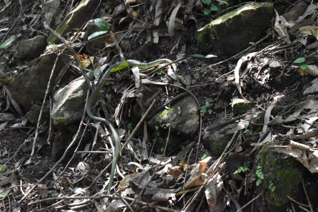 However our sense of calm was disturbed when we heard some quick movement. There to our right was a small green snake. Fortunately it was more frightened of us and was slithering away.