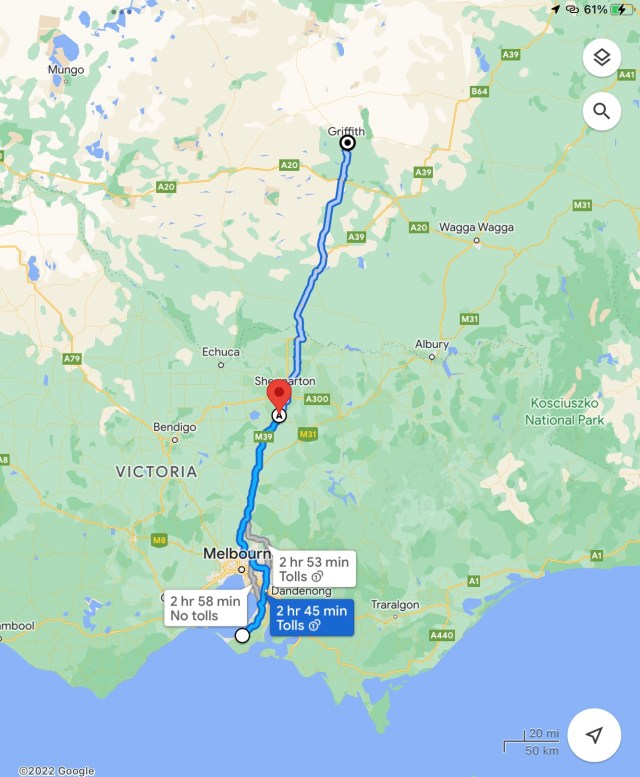 Distance travelled from Arcadia (point A) to Griffith – 288kms