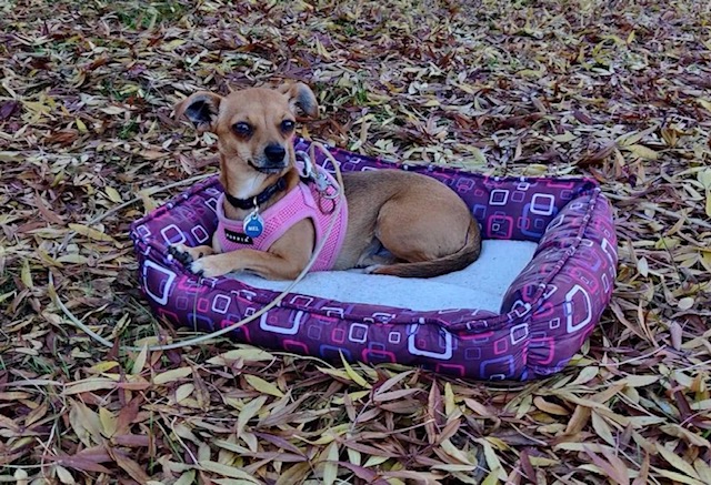 Mel was happy to be out of the vehicle and sat in her bed whilst we set things up.