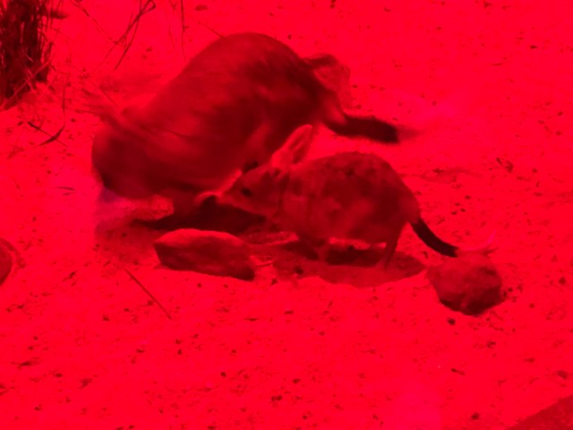 Once we had eaten lunch we drove back to the Charleville Tourist Information Centre for our 1:30 booking. First up we dropped Mel off with a staff member who had agreed to look after her while we attended the Bilby centre. Next a staff member booked us in and asked us to wait with the other attendees. A little after the session time was due to start the final group arrived. We were then shown along the old train station platform and into a small theatrette and asked to take a seat by a young lady. She introduced herself and began to give a slideshow presentation about bilbies and the Save the Bilby Project. Her name was Lisa and she was very knowledgeable and clearly extremely passionate about bilbies. The session was full and we numbered about 40. At the end of the presentation she asked could we split into two groups. This would enable us to have the best chance to see the bilbies in their enclosure in the next room. They have a mating pair and at the time of our visit a baby of a few months old also. The room was kept in night time conditions using infra red ray lights, as bilbies are nocturnal, and then during the night lights were turned on to simulate day time, during which they would sleep in an artificial burrow. So the conditions for photography were somewhat challenging. The other challenge is that bilbies are extremely active so even though I took about a dozen photos there are only a few to include here that weren’t blurred because of the low lighting conditions.