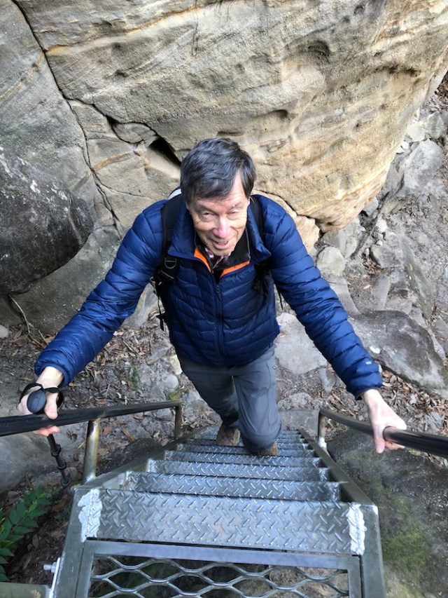 Now it was time to make our way back. We soon covered the flat section. The steep steps leading down provided a challenge for the old knees and hips. We could be thankful that at least we weren’t puffing.