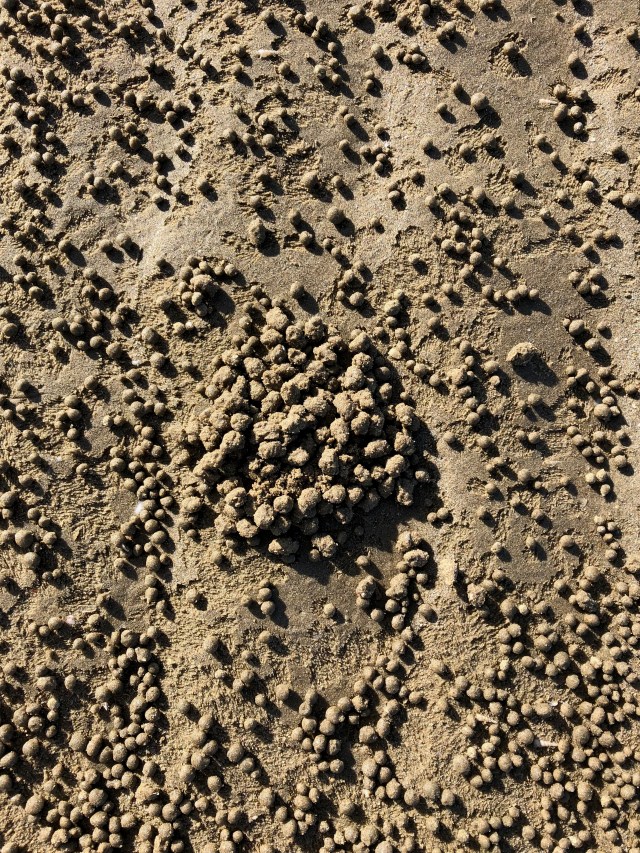 Mel also likes to investigate the many holes made by the small crabs. I found it intriguing to see the myriad of little balls of sand they leave.