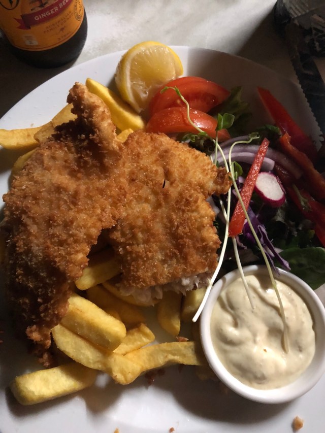 Our fish and chip meals were delicious, the fish perfectly cooked. The missing bottom edge on my fish was enjoyed by you know who sitting at our feet!