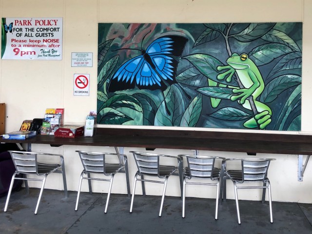 We returned to the caravan for lunch. Due to the rain we sat inside and read. Later on I headed over to the barbecue area to cook dinner. Another impressive mural was on the wall just near some tourist information brochures.