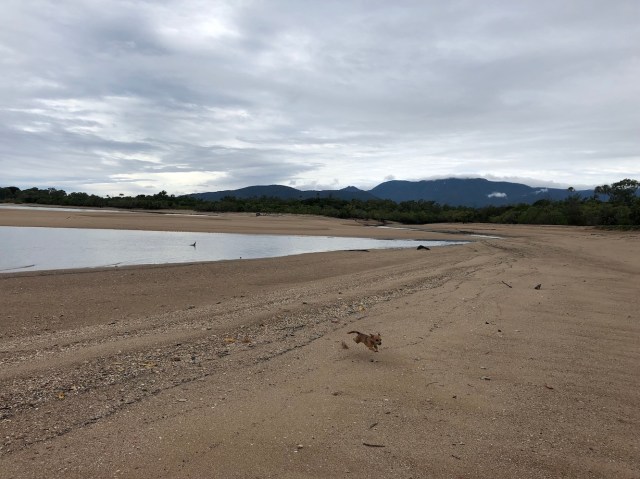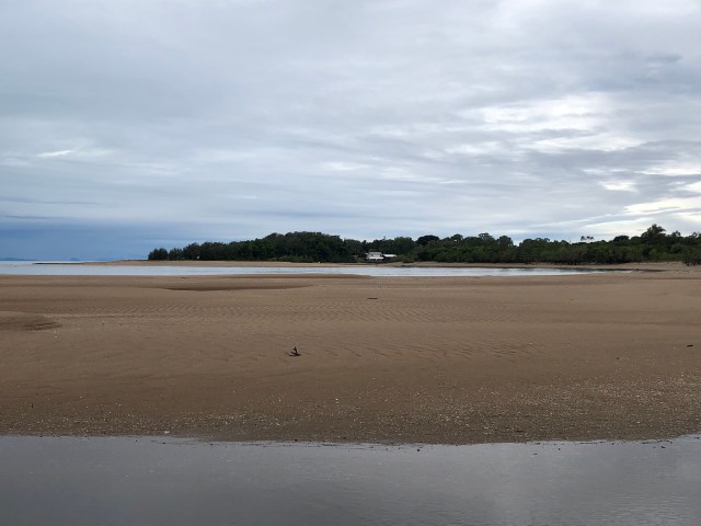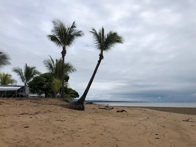 As we were finishing lunch the rain eased off so we decided to take a quick look around Balgal Beach. There were a couple of barbecue shelters, some free camping spots and a small beach. Someone had even constructed a small shelter on the beach. Perhaps it gave shade shelter on a sunny day but we thought you’d get soaked if you sheltered there whilst it was raining.