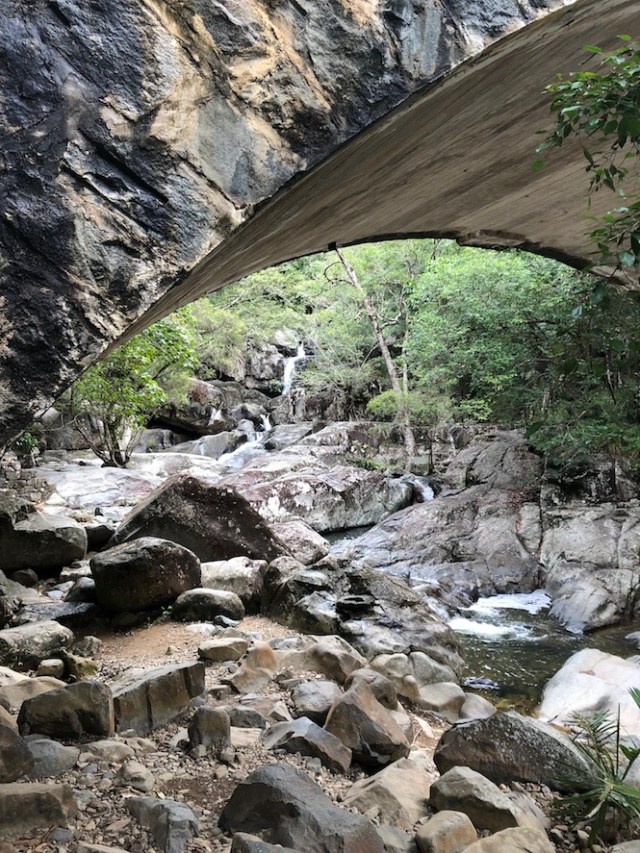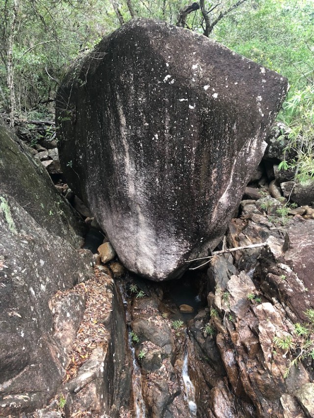 before walking back uphill and swapping over with Karen on dog sitting duties. After relating where I had been and what could be seen, Karen set off for her own exploration while Mel and I sat in the car. When Karen returned we set off back down the windy road towards Rollingstone. We did make one more quick stop at the aptly named Noah’s Ark Creek. This rock certainly looked like the front end of an ark as the trickle of water passed by.