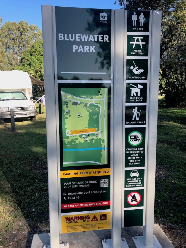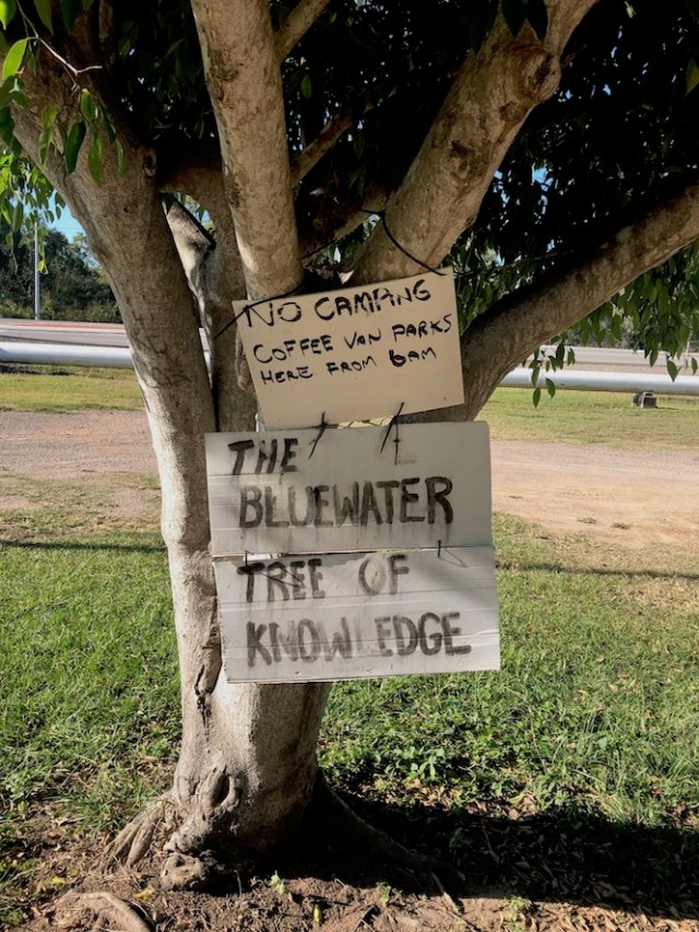 It was only a half an hour down the road to where we planned to stop at Bluewater Park Free Camp. Townsville had been our original planned destination but we couldn’t find a vacancy at any of the caravan parks because the Supercars Championship car race was in Townsville that weekend. Anyway it gave us a chance to do some free camping and see how our caravan set up went when we didn’t have power or water to connect into. Karen had made a booking via Townsville Shire’s website. On their website she had read that Bluewater Community Centre ran a barbecue dinner night at their building on the other side of a green space near the free camp. So we thought it would be good to support them later that night. When we arrived we drove in past the coffee van, which was at the ‘Tree of Knowledge’,