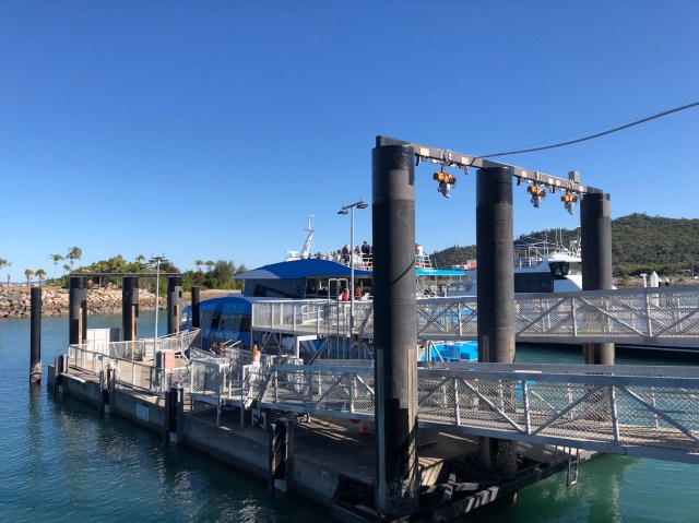 to the far end before coming back to the bus stop for our return trip to Nelly Bay. The ferry was just docking at the pier.