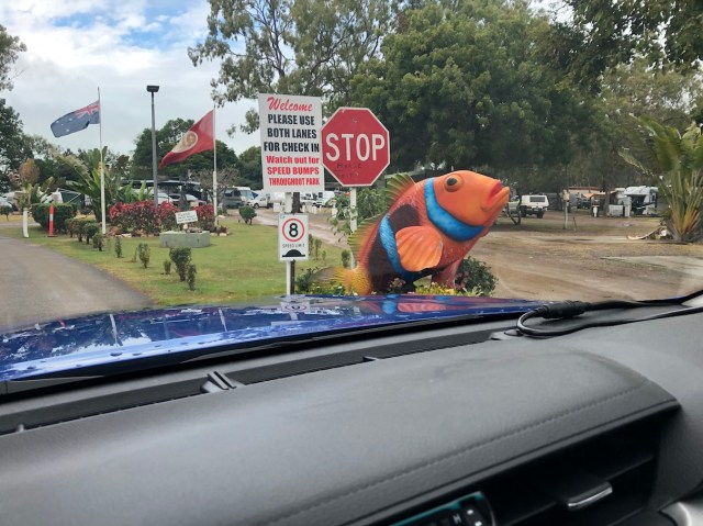 Finally we came to the turnoff to the little hamlet of Clairview. We had booked at the BarraCrab Caravan park. Here’s the colourful entry.