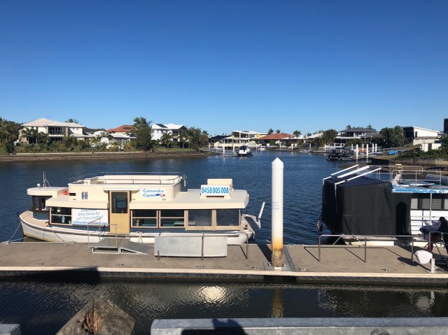 At this point we turned back as we would be driving this way to have lunch with friends who were staying in Maroochydore. Back at the caravan we changed ready to go out to lunch. The drive from the caravan park to Pelican Waters pub wasn’t very long, just a few minutes. We met our friends in the carpark and soon had a table outside on the balcony overlooking a canal. It was quite cool, even in the sun, but Mel was allowed outside on the balcony but not inside.