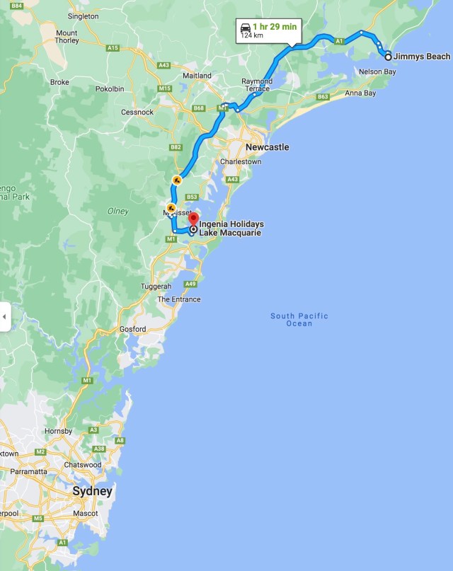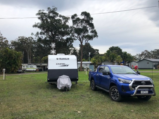 Our trip continued without any problems following the right route to reach the Lake Macquarie Holiday Park at Mannering Park by noon. We were soon set up but due to the recent rain in the area found ourselves on a muddy site.