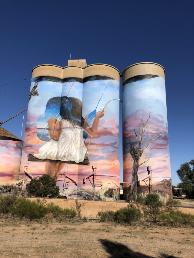 Next up we found a nice spot in a park for a late lunch before driving down to Avoca. We’d booked a caravan site there for the night earlier in the day. Once we had set up we drove to their silo. Again it was a metal one. It featured a Barking Owl. It had been painted by Jimmi Buscombe in 2021. At night you could turn self timing lights on to see it.