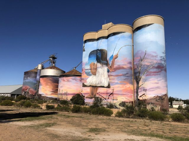 Awoke to a classic Autumn morning, cold with a clear blue sky. Once we had eaten breakfast we packed up the caravan and headed over to take one last look at the silo art in Lascelles. It was tricky to take a good photo because half the silo was basking in sunlight and the other half was in shadow. Ah well, off we drove up to Sea Lake. The silo art was easy to spot as we drove into town. It was one of the most colourful we had seen.