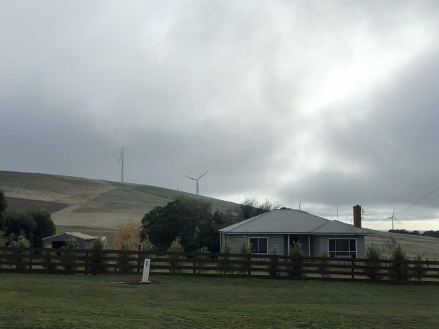 Two degrees the next morning didn’t have us rushing out of bed but after hot porridge with honey and banana we packed up and started the trip back towards home. Wind powered turbines could be seen in the mist as we drove through the farming community of Waubra.