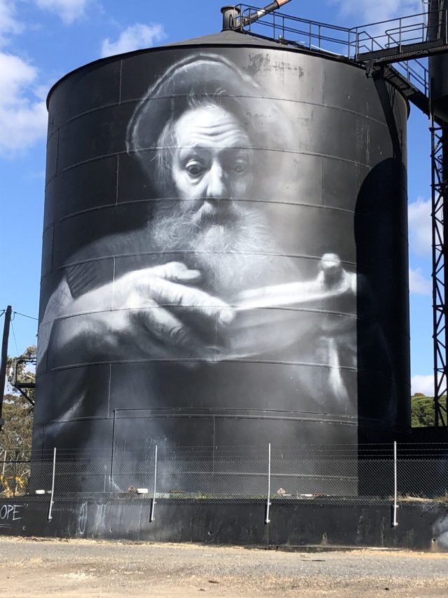 Back in the car we headed down to St Arnaud, about an hour away. On arrival we saw the silo art pretty quickly. It featured a husband and wife during the gold rush days of the 1850s.