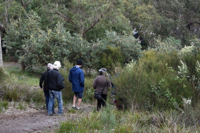 Even though winter is upon us taking a walk is always on our agenda. So when our Mornington Peninsula Australian Plants Society group organised a walk at Bunarong Park in Frankston we were interested to join in. The tricky bit is that there are not a lot of car parking spaces there so we made sure we were a bit early so we could snare a spot. Right next to it was a lovely garden adjoining the park with a beautiful Hakea ‘Burrendong Beauty’ in bloom.
