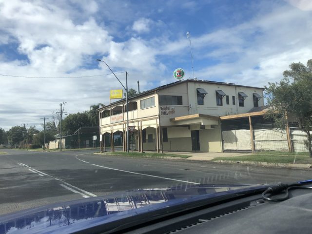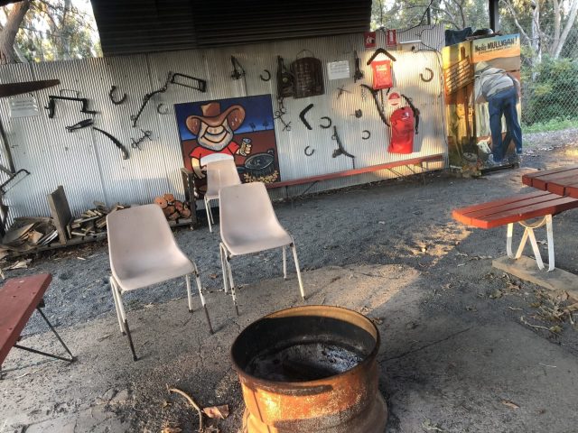 I then drove into town to the windscreen workshop. Given we were a long way from both Brisbane and Sydney it came as no surprise when I was told it would take two weeks for a windscreen to be delivered. However they did say it would be okay to drive up to Brisbane and it would be easier to get a new one fitted there. Back at the caravan park we took a walk around with Mel. The bar shed was well named