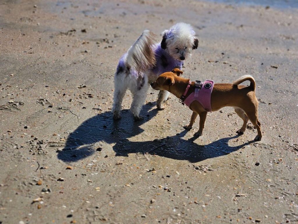 Just as we were coming to the little pier where we had started we met another dog, it had been treated to a purple hair change!