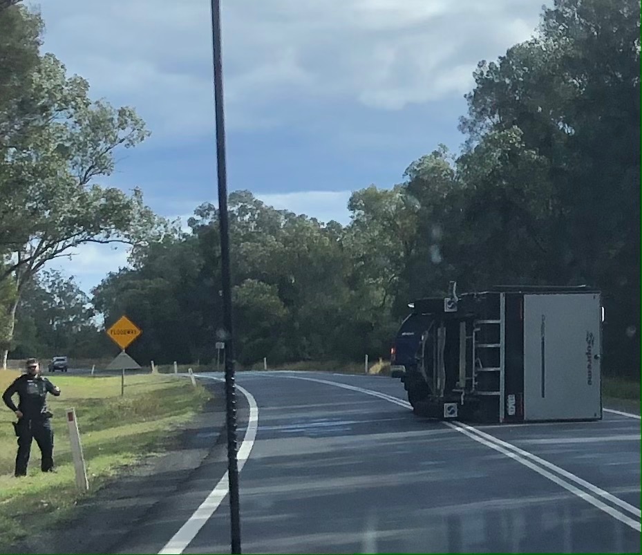 continued on through the little town of Ducklo. Just after that we came upon a police vehicle with its blue lights flashing so we slowed down. To our amazement, there laying on its side was a caravan.