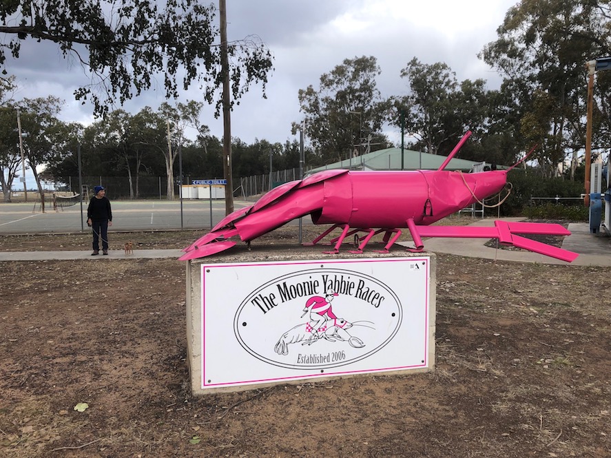 Secondly it hosts yabby (freshwater crustacean) races each year in March. The ‘big’ pink yabby proudly on display at the crossroads also.