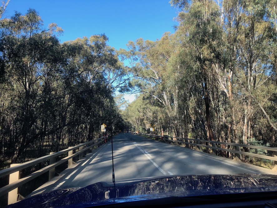 winding our way on the road through the heavily treed, flat billabong flood-land of the Murray.