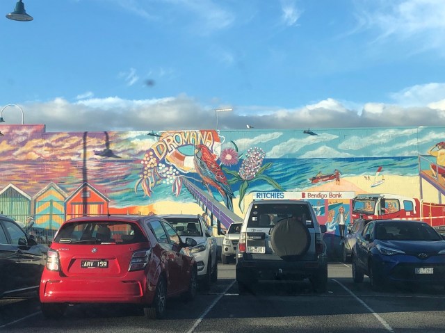 At this point we headed east to Yea so we could drive around the east side of Melbourne rather than driving though it towing our caravan. It’s lots less stressful we find. Yea has a very clean and well presented toil-art block, featuring local artists’ work, which we visited.
