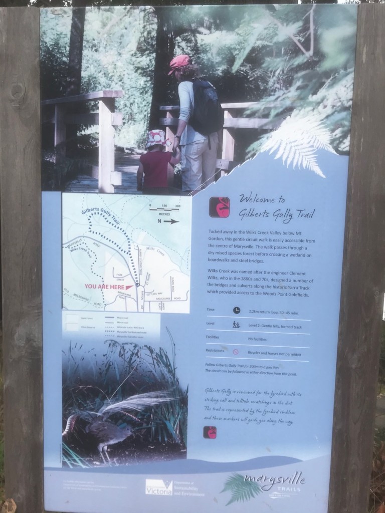 Whilst in Marysville we planned to do a few of the many walks in the area. However they had to be dog friendly walks. We couldn’t walk in the Yarra Ranges National Park and not the walk at Marysville’s most popular attraction, Steavenson Falls either. After a visit to the Tourist Information Centre and a chat with a very friendly and knowledgeable staff member we set off on our first walk along the Gilberts Gully Trail.