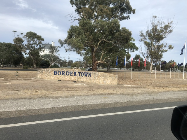 Back in the car we drove on and within fifteen minutes we arrived at the Victoria/South Australia border. What we had forgotten was that you can’t take fresh fruit between states in Australia so rather than throwing them out Karen and I ate the two apples we were carrying before I posed for a photo at the border sign.