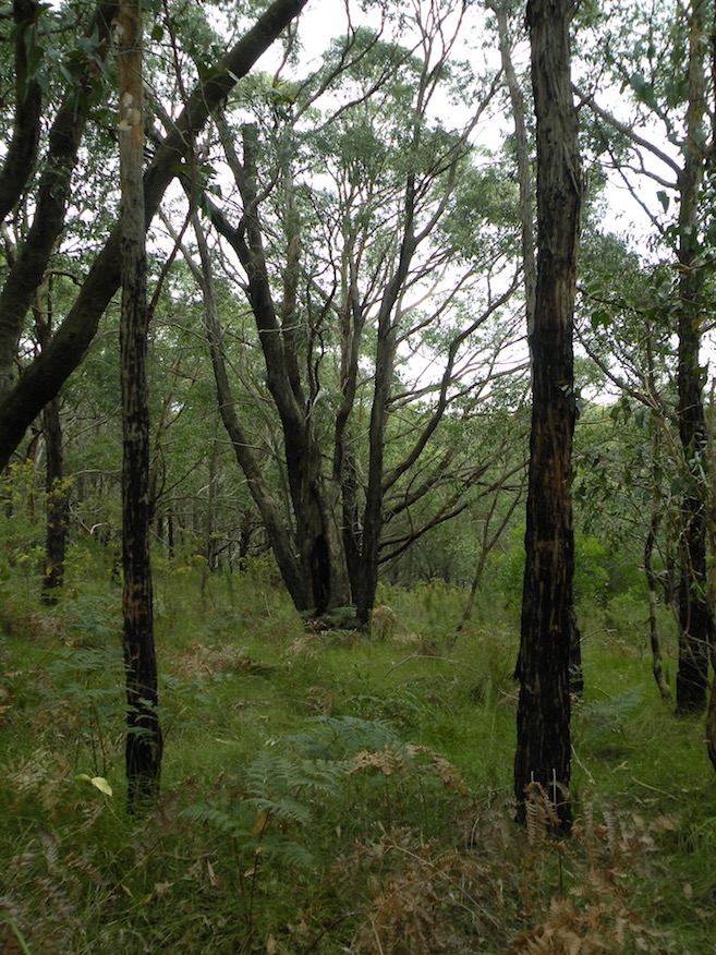 The trail begins in an area of tall eucalypts and under-storey plants.