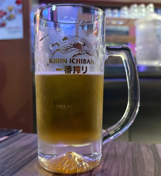 before reaching Miji Japanese Bar and Grill. We ordered some drinks while we waited for Kaede to arrive. You will note the image of Mt Fuji blown into the bottom of my Japanese beer.